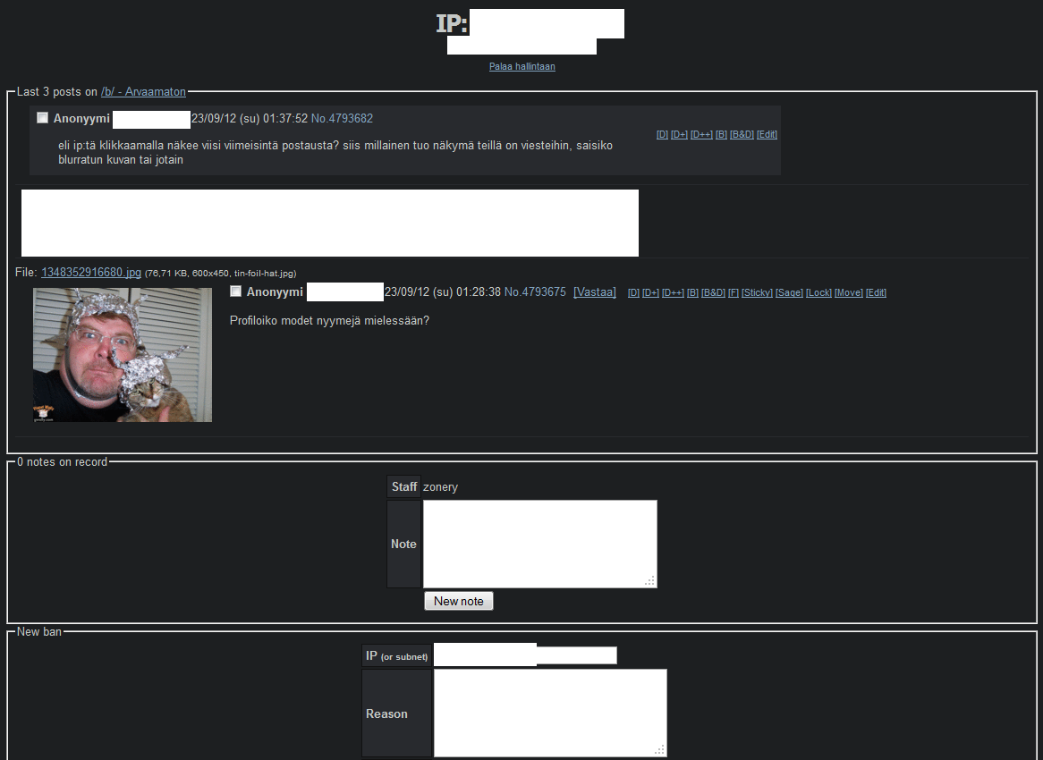 Laudoilla on se vain huono juttu että jos on hidas postaustahti niin jotkut ip-osoitteet jäävät helposti muistiin ja modet, jotka usein lurkkaavat lautaa nähden kaikkien viestien ip-osoitteet, tahtomattaan viikkojen sisällä muodostavat joitain käsityksiä tietyistä postaajista. Varsinkin aktiivisimmista postaajista modeilla on aika vahvat käsitykset minkälaisia ihmisiä he ovat.