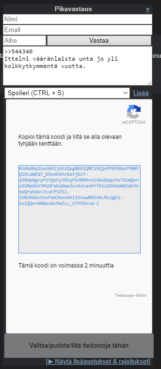 Noniin, mitäs käptsälle on nyt menty tekemään, kaikki nämä vuodet(?) se on toiminut ihan välttävästi ihtelläni, joskus joutuu pikavastauksen sijaan käyttämään normovastausta ja sitäkin joskus tosi harvoin päivittämään, mutta nyt on ihan kakkapaska. Pikavastausikkunaan ei edes tule tuollaista koodinsyöttöruutua ja välillä joutuu odottamaan muutenkin helvetin kauan että kuvat yleensä viitsii tulla näkyviin. Vai onko minut profiloitu paskaksi postaajaksi ja joudun kärsimään jostain spesiaalicaptchasta?