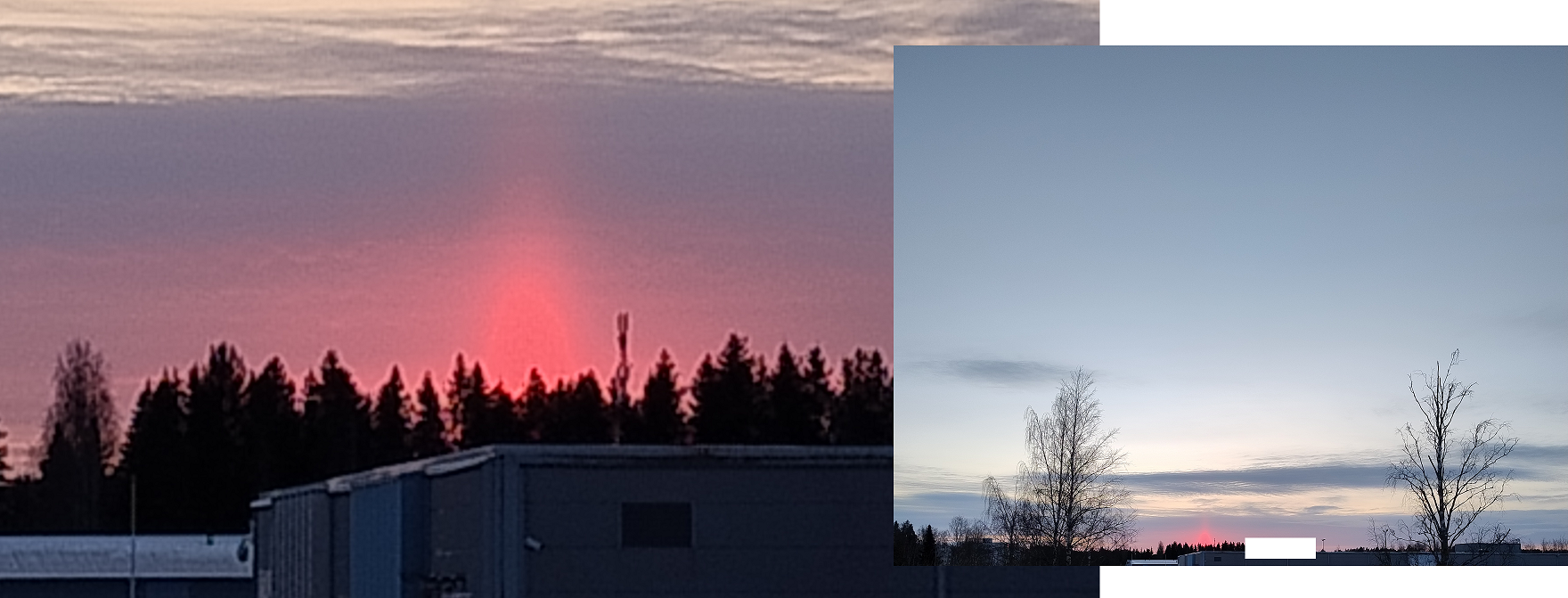 Jotain hyvää sentään jossain, kotiin laahustaessa aurinko oli juuri laskemassa ja siitä nousi ylöspäin semmoinen jännä valoilmiö. En jaksanut kaivaa silloin puhelinta mutta kaupasta tullessa aurinko oli jo taivaanrannan takana ja siitä tuli vielä sellainen jännä punainen valoilmiö. Huonot kuvat, mutta kai siitä jotain selvää saa. Zoomauskuvassa väritkin on sinnepäin.