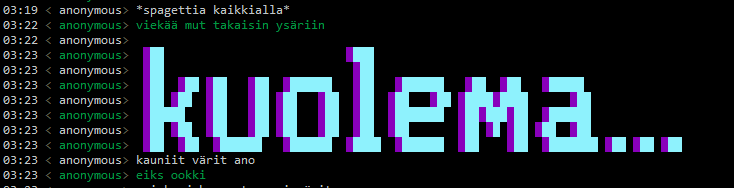<y6pbld4ko> pudotan anot pepustani teidän huulille löysän paskan t. bm