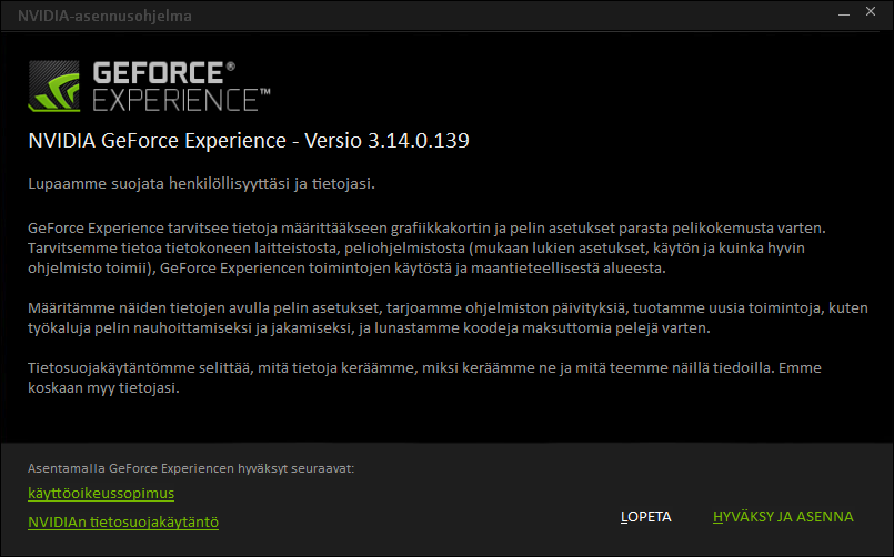 Jaa'a, enpä käytä tuollasia paskakkeita. Pelikoneesta kyllä löytyy nvidian näyttis ja siinä on joku Windowsin automaattisesti asentama WHQL-ajuri. Nää gaymer-näyttisajuripaketit on kyl Windows-ajurimaailman suurinta syöpää, menee jopa tulostinajurien bloatin ohi.