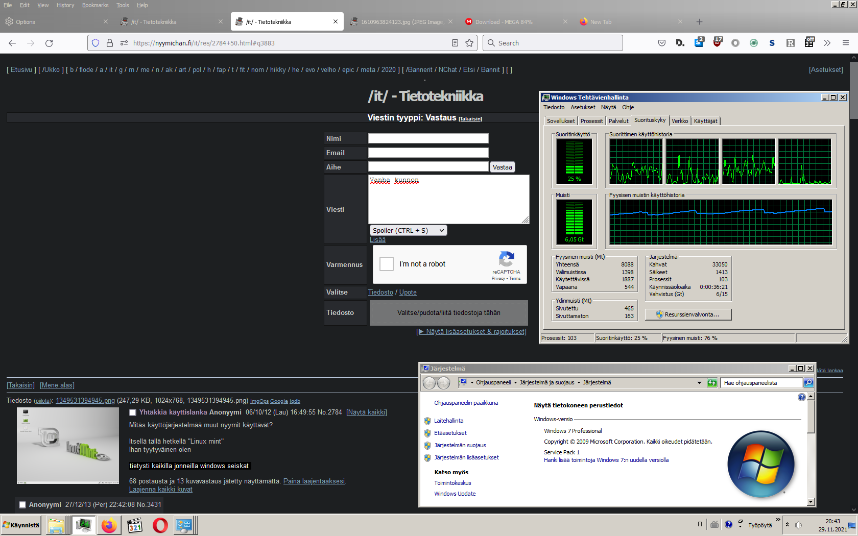 Sen jälkeen taas pian 1 vuosi windows 7 samalla kun yritän siirtyä GNU/Linux alustalle. Tällä hetkellä käytän lubuntua (systemd paskaa), mutta tästä sitten pian vaikka Antergokseen ja loppujen lopuksi Gentoohon tai muuhun sellaiseen. Tai sitten headless minimal install.