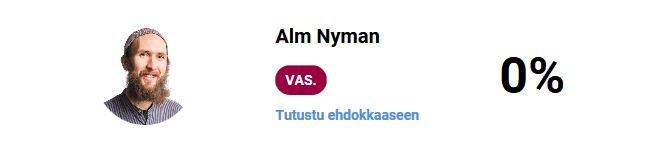 Äänestin jotain vanhaa perusnörttiä. Pirkanmaan alueella numero 8. Ylen vaalikone sano, että se tykkää halla-ahosta. En ees muista nimee enää. Puhdas puolueääni, mutta tulipahan vaihteeks äänestettyä. Vois nukkua sit taas parit seuraavat vaalit.